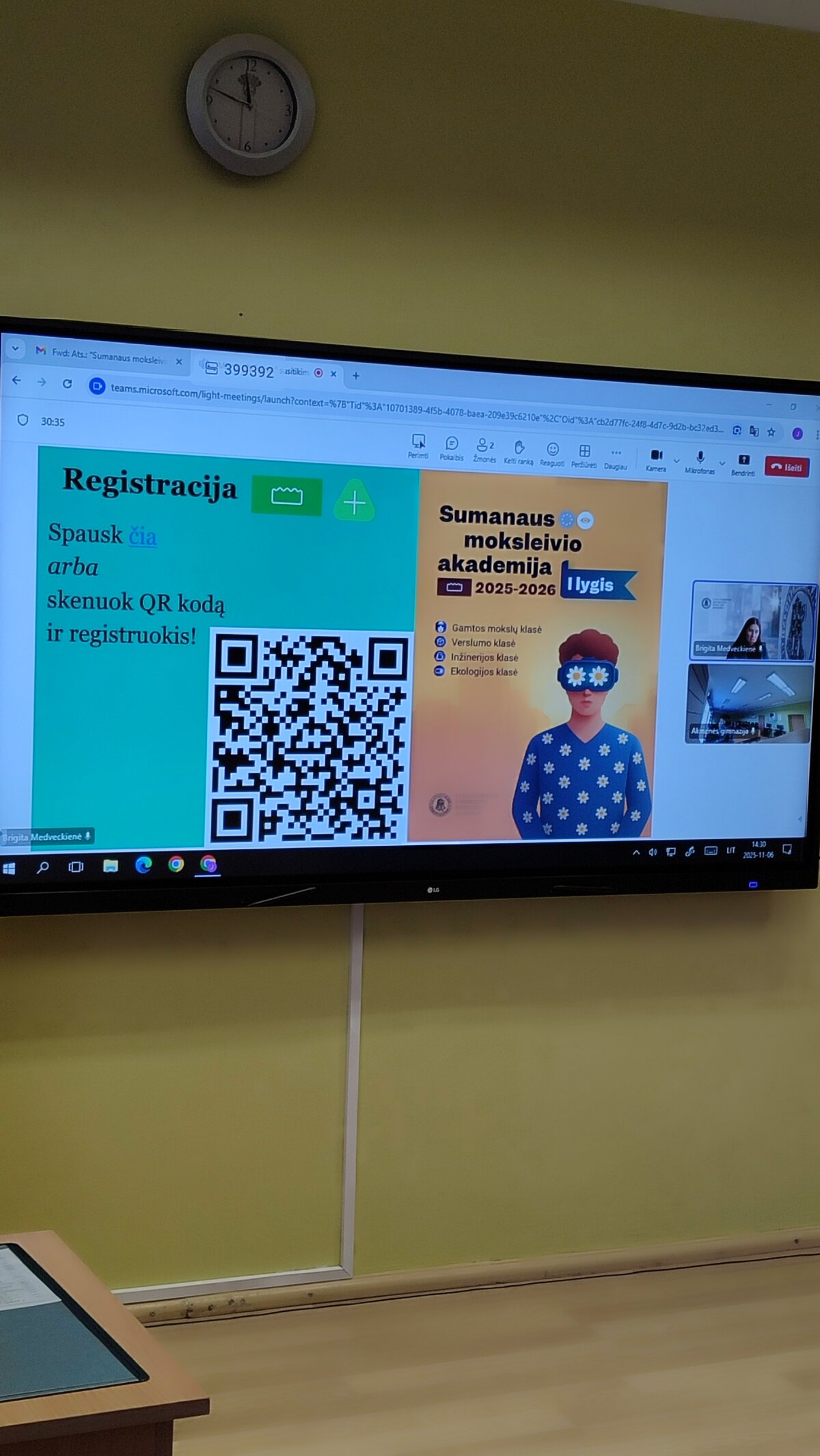 Lapkričio 6 d. Akmenės gimnazijos 10 klasės mokiniai dalyvavo nuotoliniame susitikime su VDU Žemės ūkio akademijos neformaliojo švietimo koordinatore dr. Brigita Medveckiene. Viešnia pristatė projektą „Sumanaus moksleivio akademija“, skirtą 10–12 klasių mokiniams.